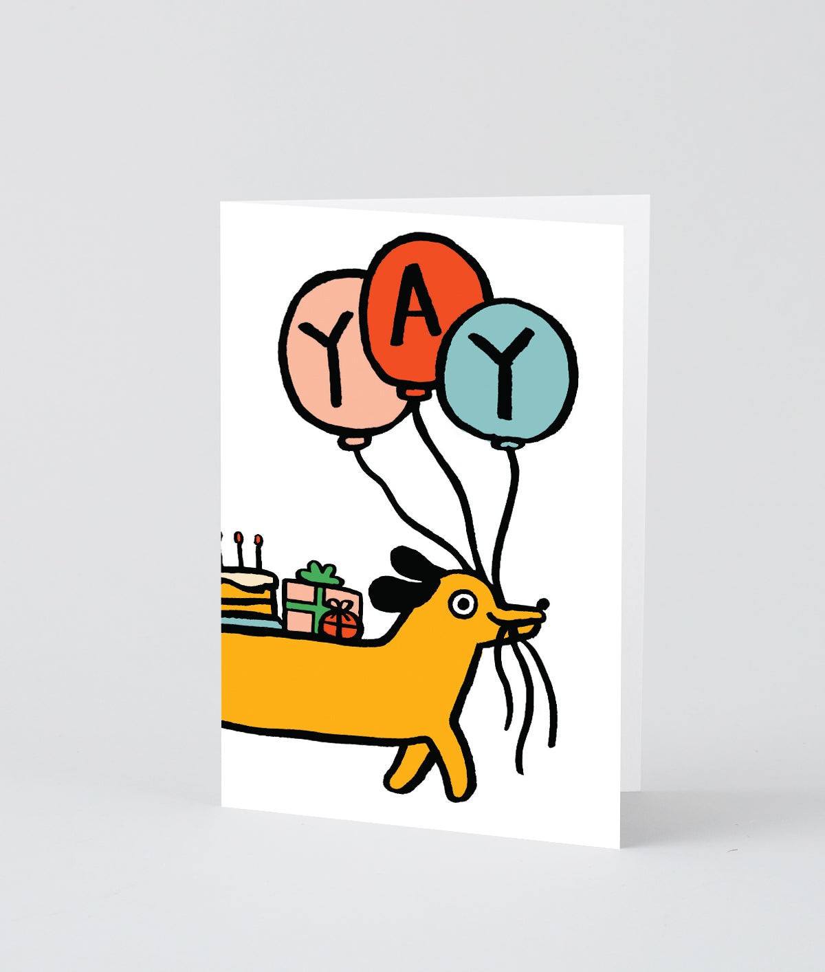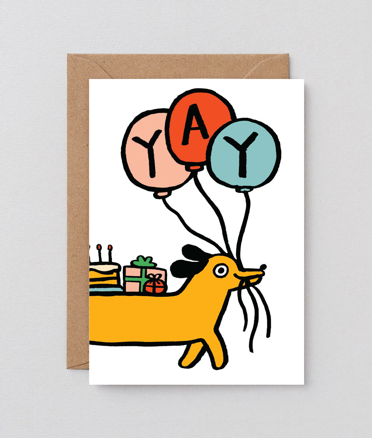 A happy pooch and his birthday balloons. Joyfully illustrated by London-based illustrator Alice Bowsher in bright colours and her signature black, brush line work.