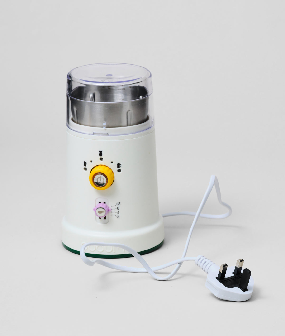 - Compact, adjustable blade grinder that holds 84g coffee beans