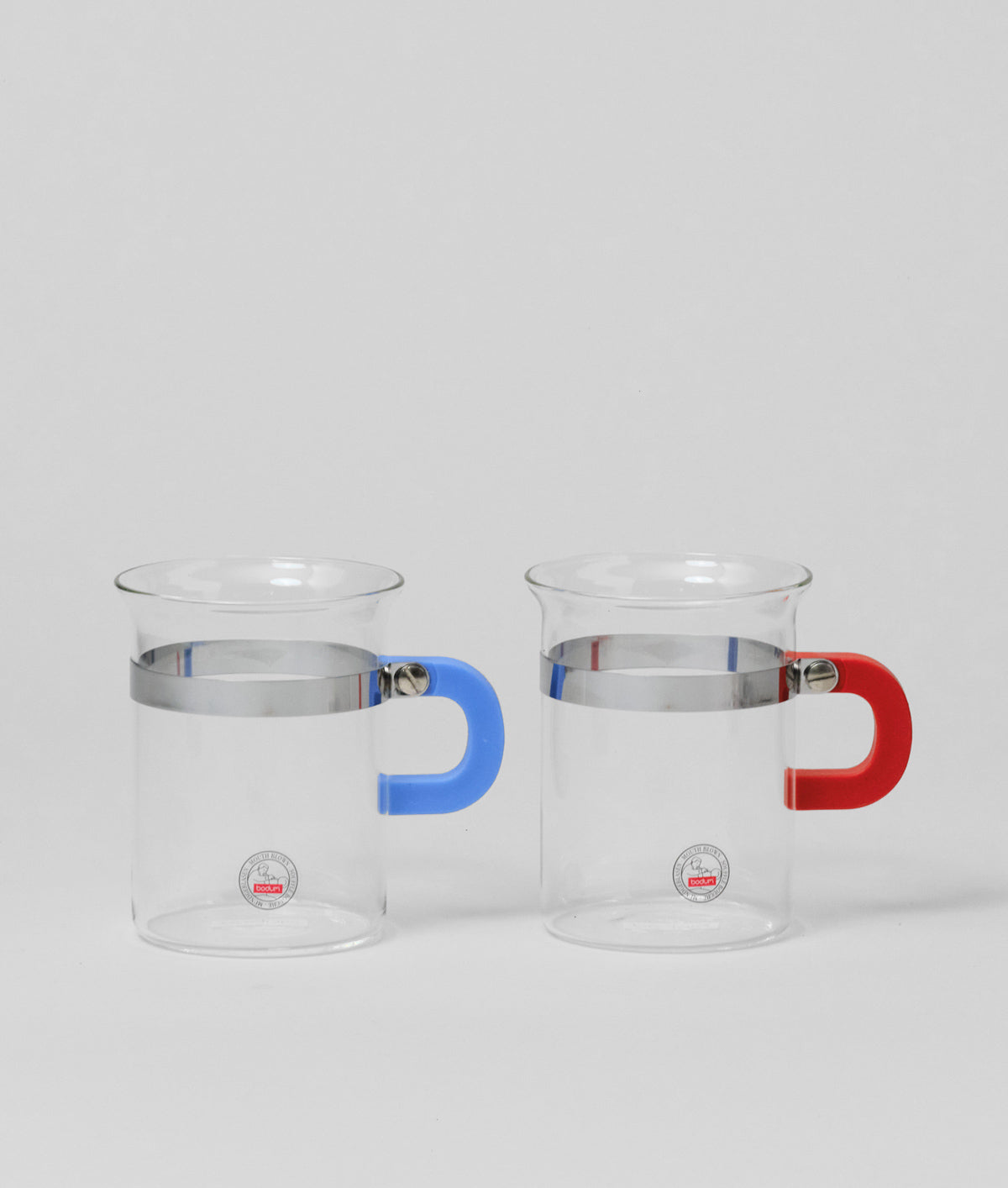 - Set of two tea glasses with red and blue handles