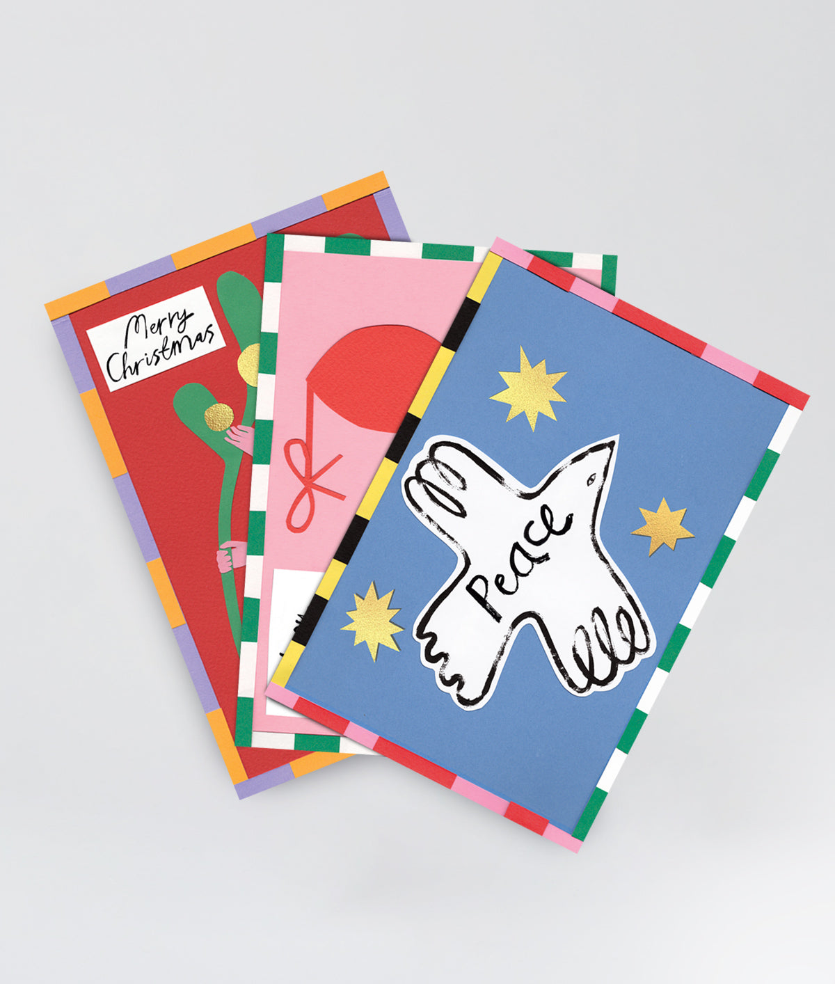 A set of six charity Christmas cards designed by Rosy Nicholas in her playful paper-cut style.