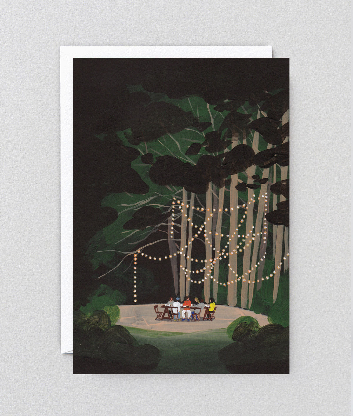 This fairy-lit forest scene is a dream dinner location. An irresistible art card design, rendered in deep greens, white lights, and pops of colour.