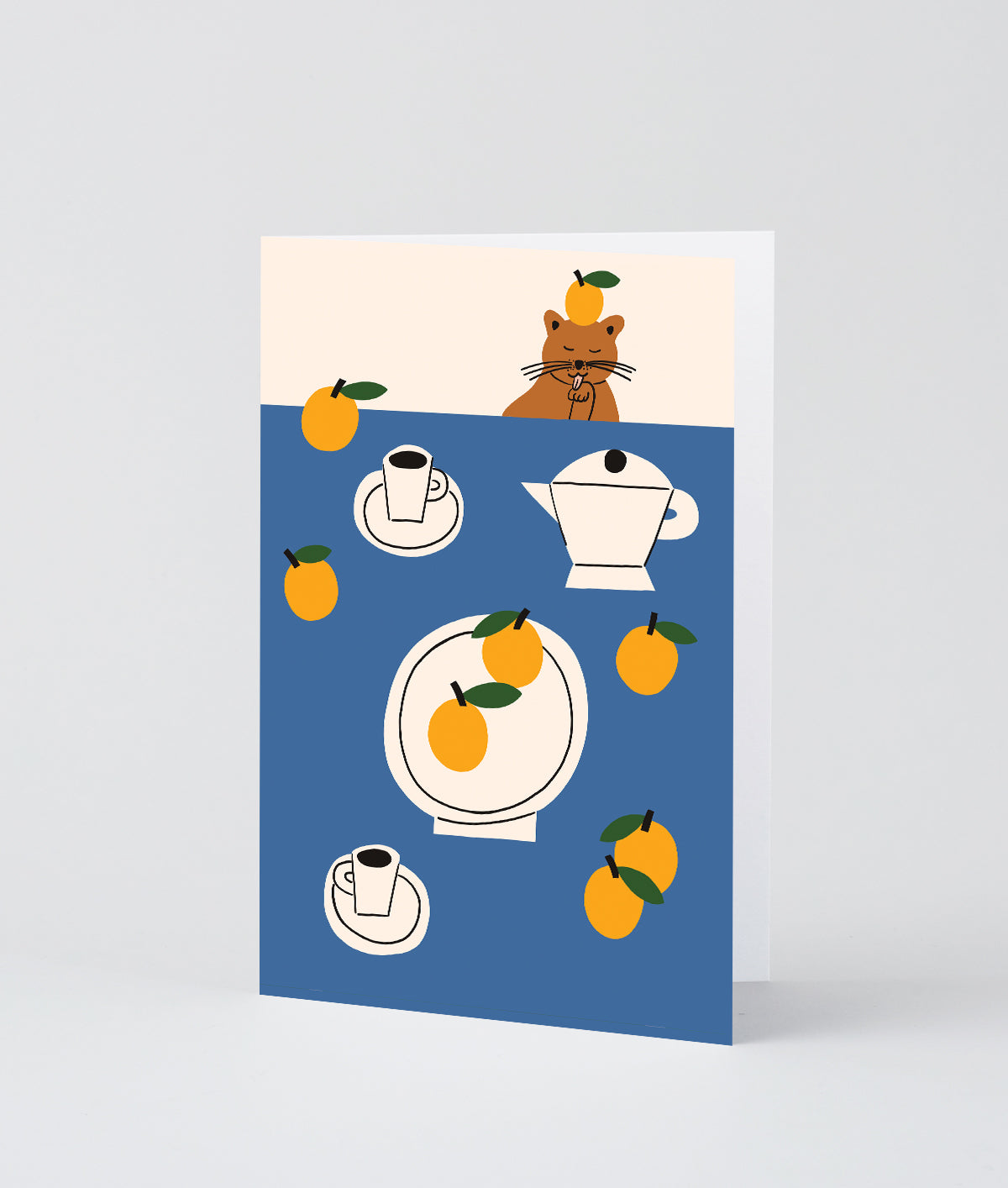 The perfect blend of coffee, cats and vitamin C, this charming digitally drawn art card by Swedish illustrator Karl-Joel Larsson.