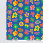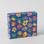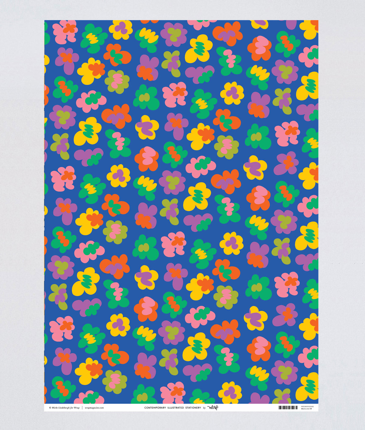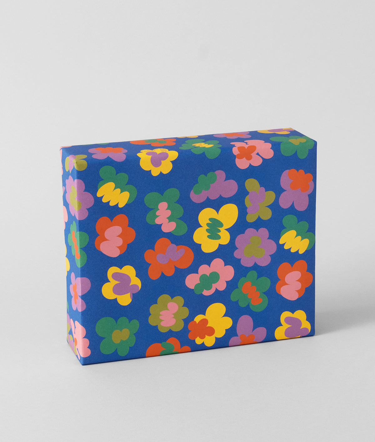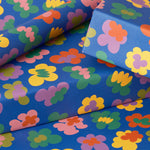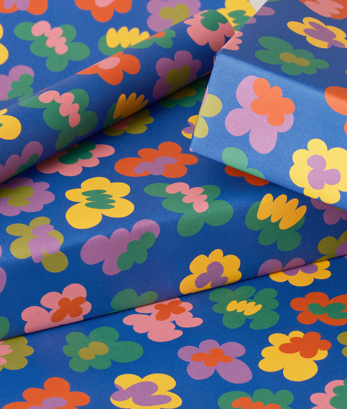 Bright abstract flowers and colourful squiggles on a vivid blue background make this wrapping paper perfect for any celebration.
