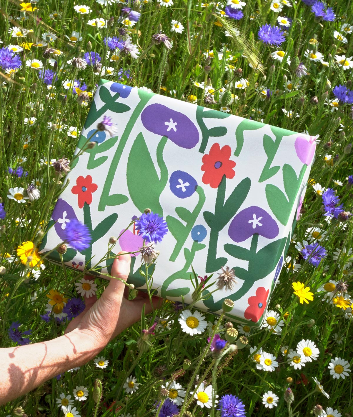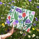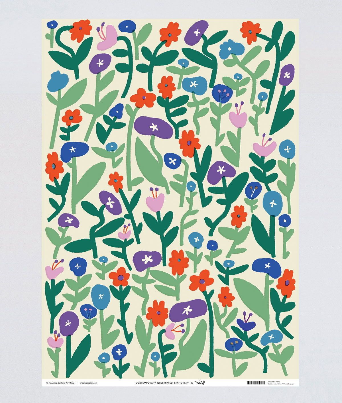 This pretty pasture of pinks and purples is interspersed with bright pops of red and blue. An irresistible wild floral wrapping paper designed to catch the eye.