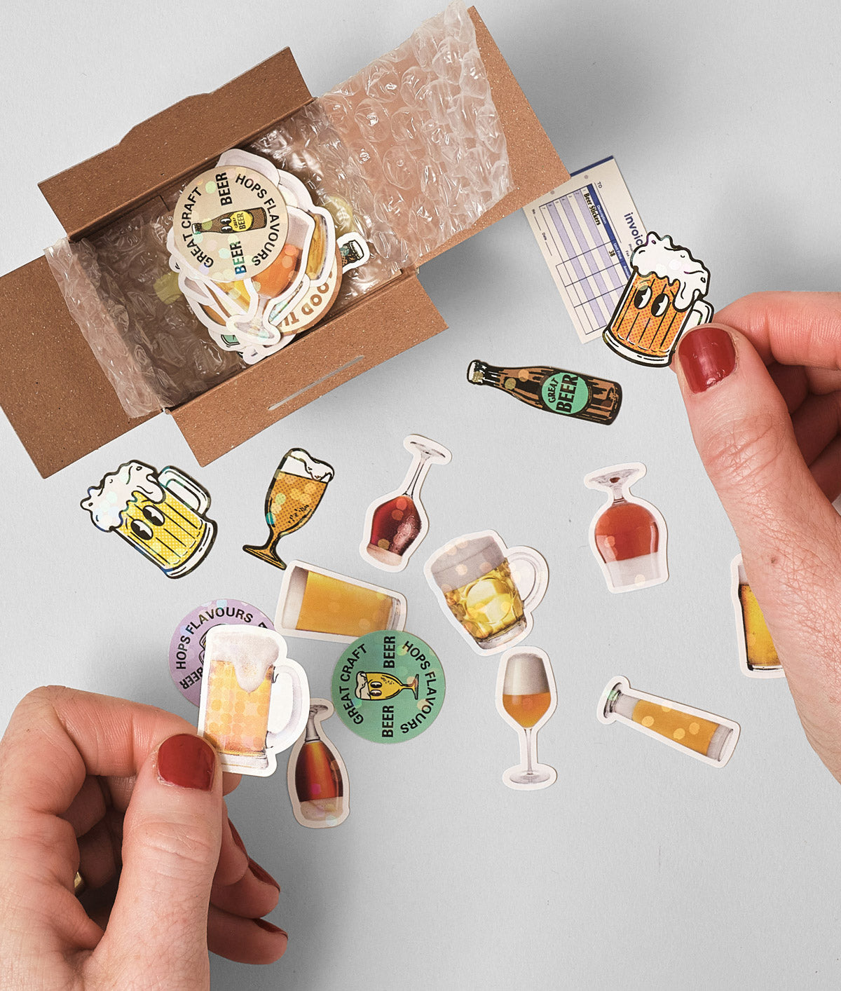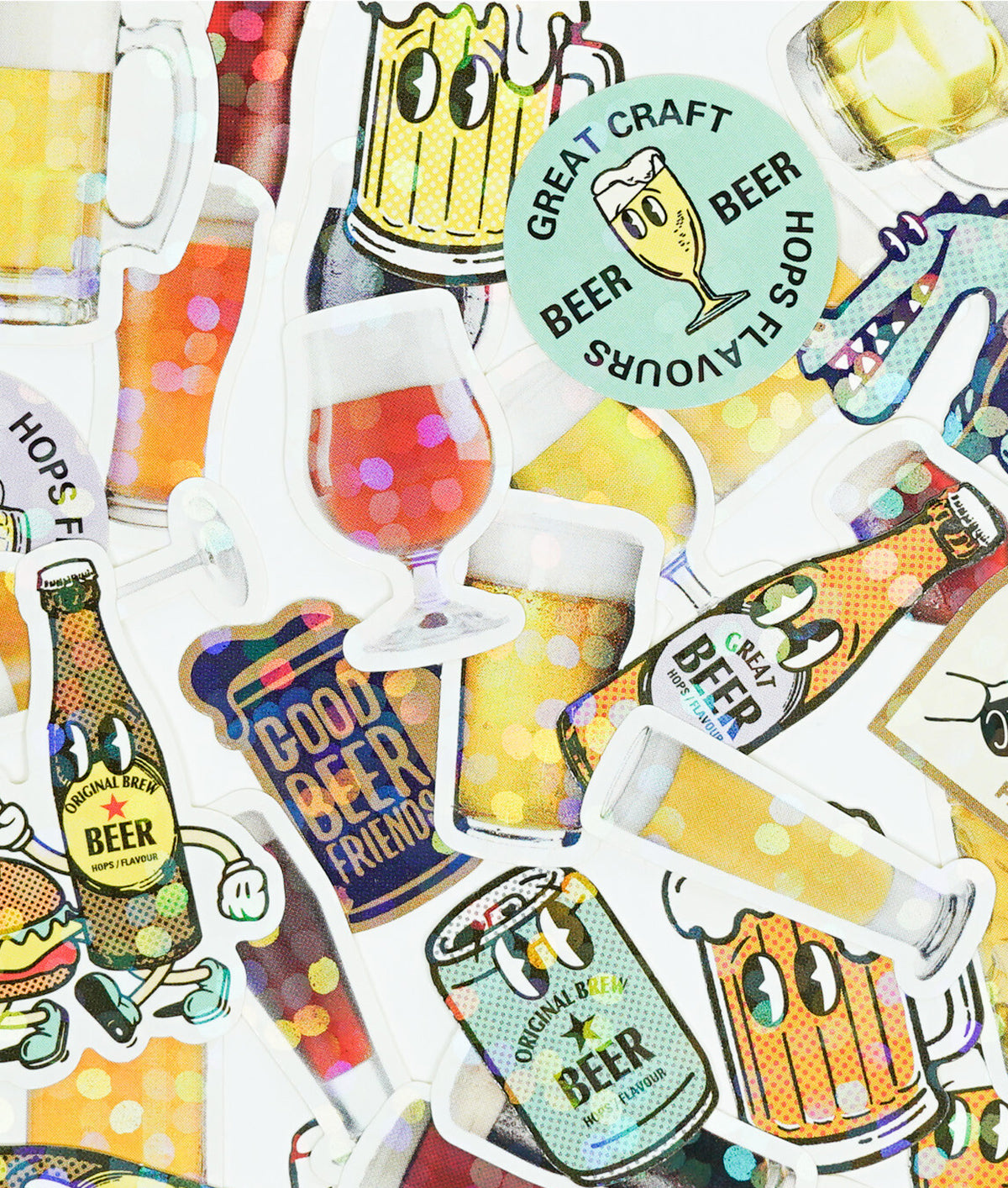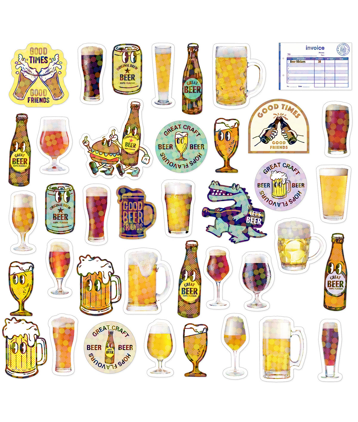 - Approximately 40 hologram beer themed stickers inside a miniature cardboard box
