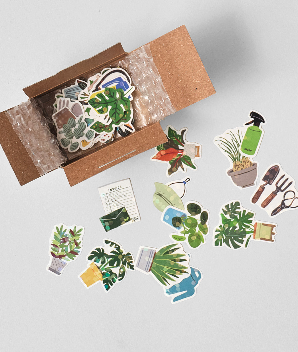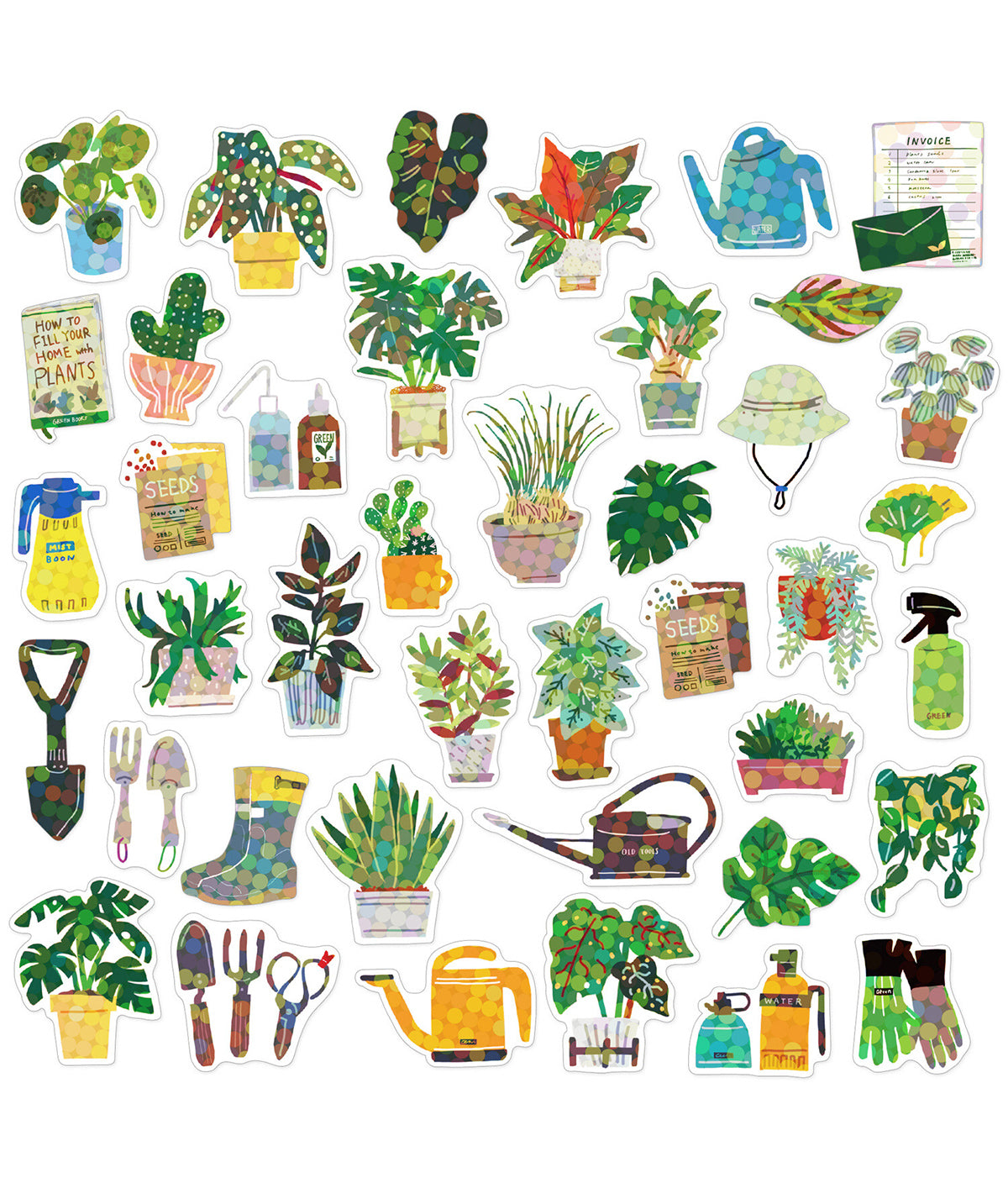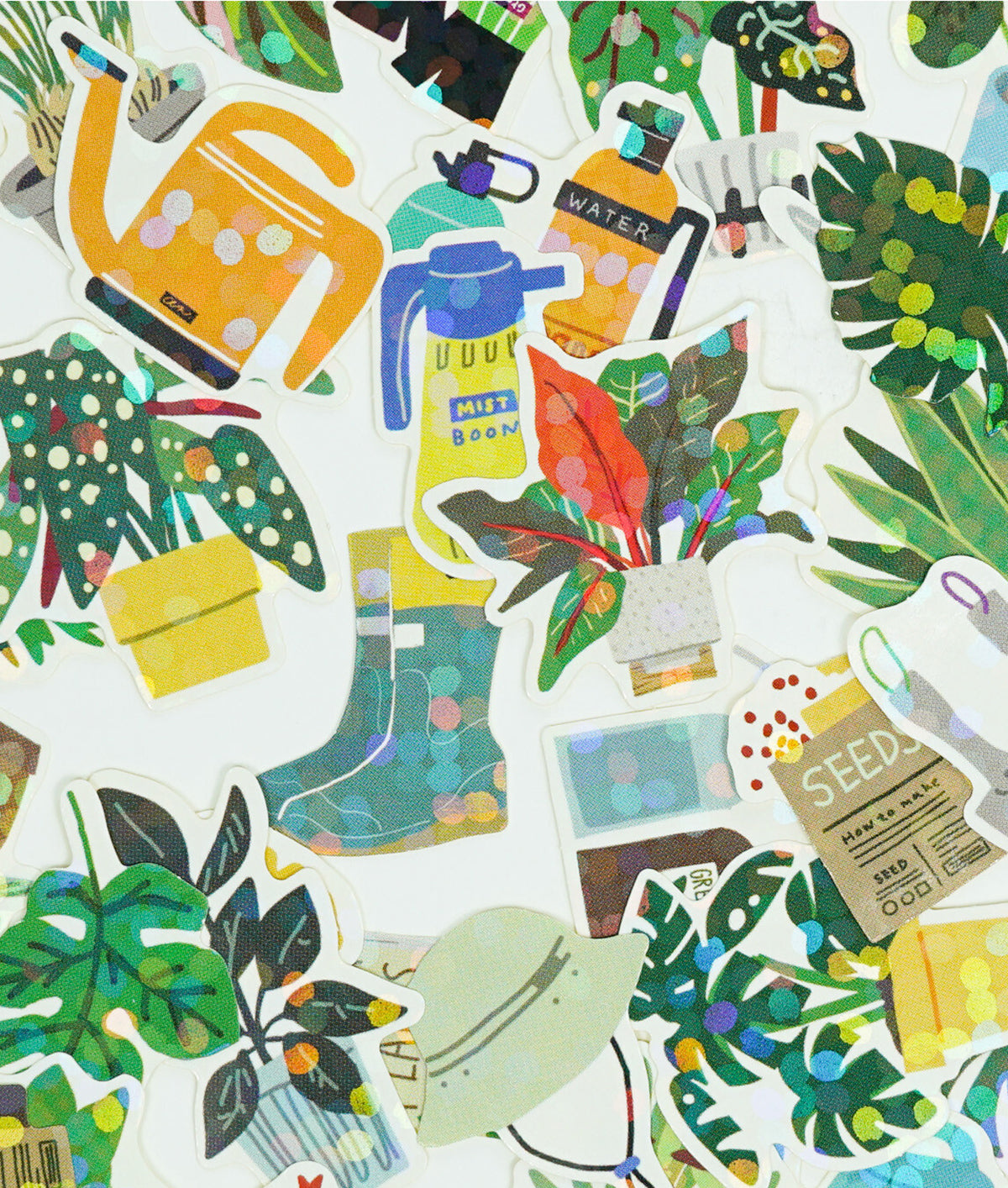 - Approximately 40 hologram gardening themed stickers inside a miniature cardboard box