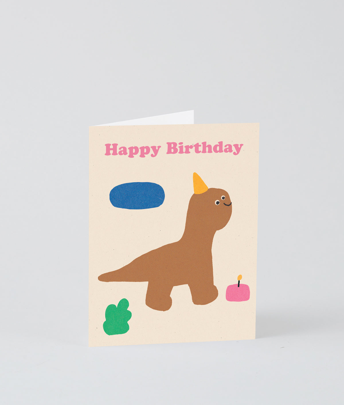 This prehistoric pal is ready to party. Cute and colourful, this birthday card design is sure to please any little monster.