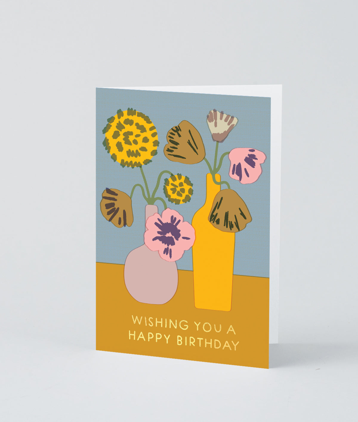A charming birthday card boasting vases spilling over with freshly cut flowers. Finished with a gold foiled birthday greeting.