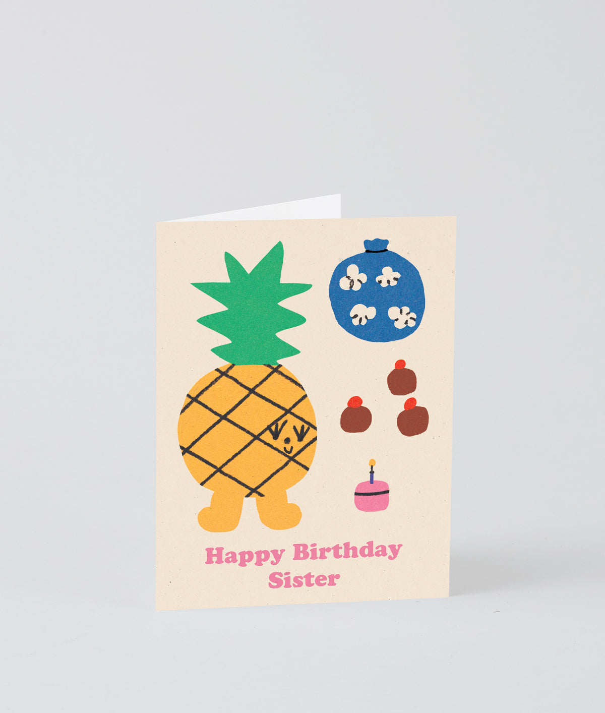 The sweetest birthday card for the sweetest sister. This kids' greetings card is designed with simple shapes and smiley cartoon figures.