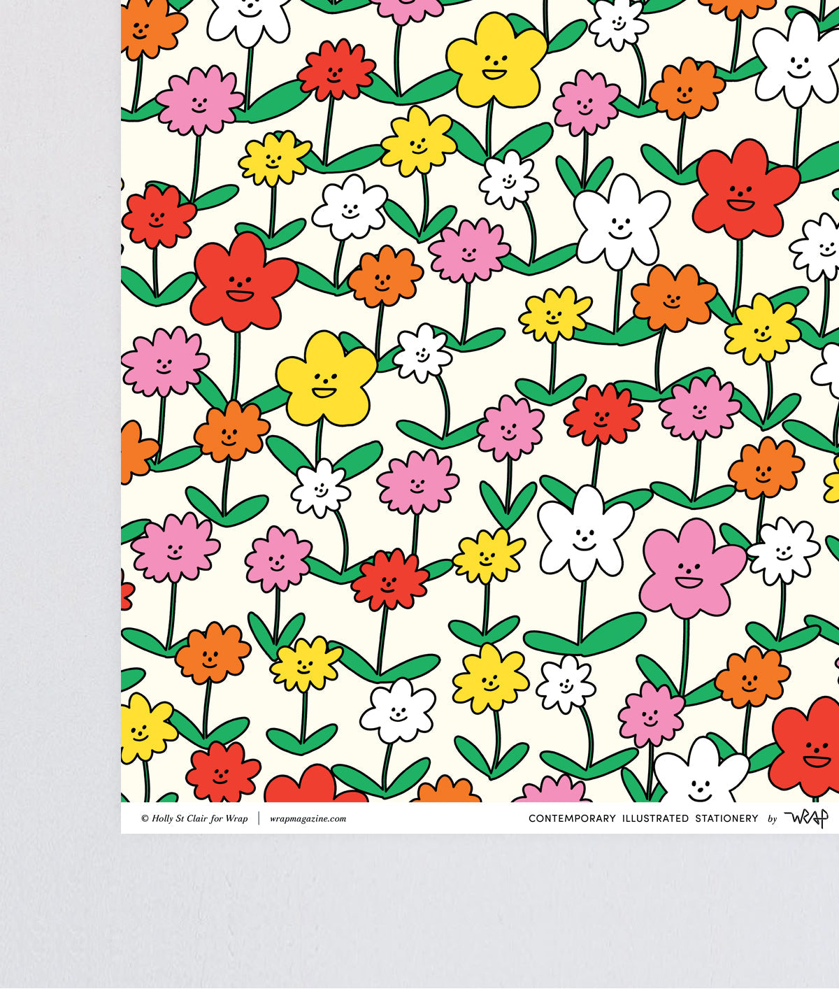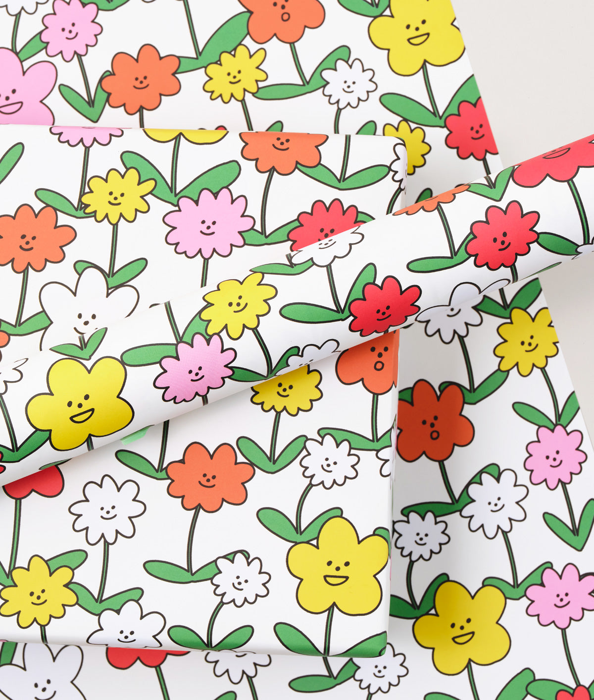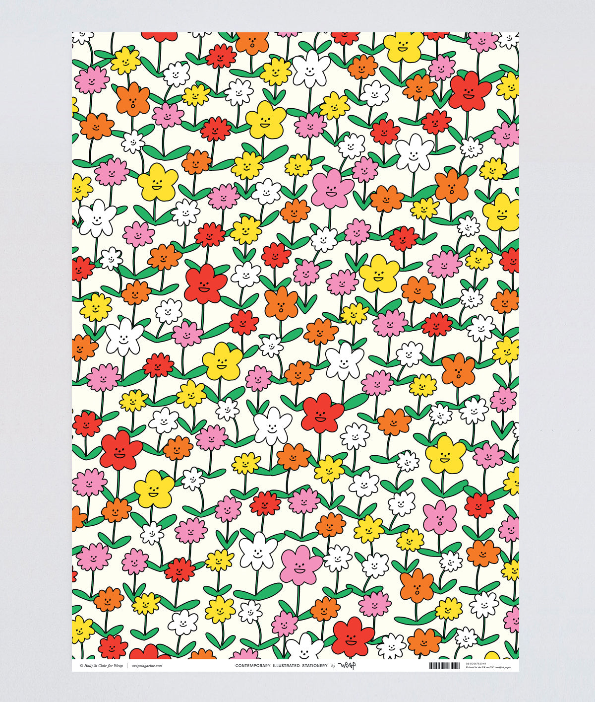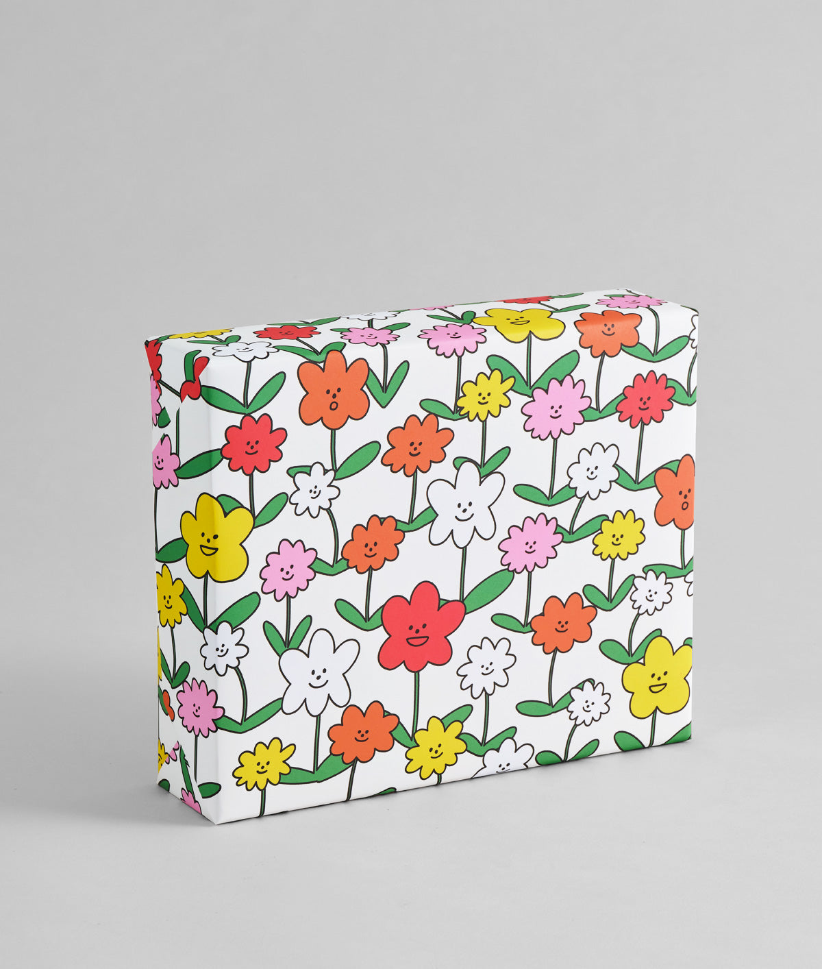 A repeat pattern of jolly blooms on this wrapping paper from London-based illustrator, Holly St Clair. These colourful, floral faces have been printed on a cream base to make their petals sing.
