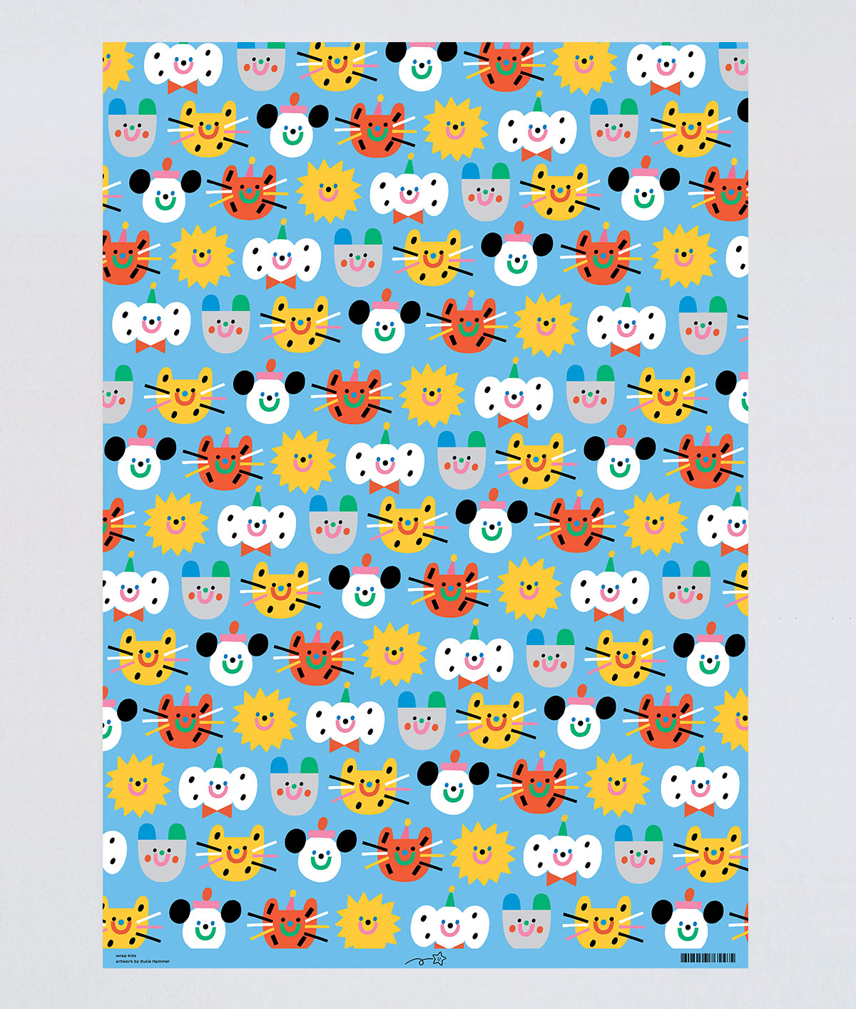 Party hats at the ready, these beaming buddies are waiting for the fun to begin. This irresistibly cute and colourful children's wrapping paper design is sure to be a crowd pleaser.