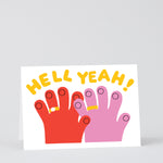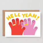 A fun, illustrated engagement card with a big HELL YEAH attached to it.