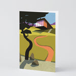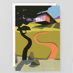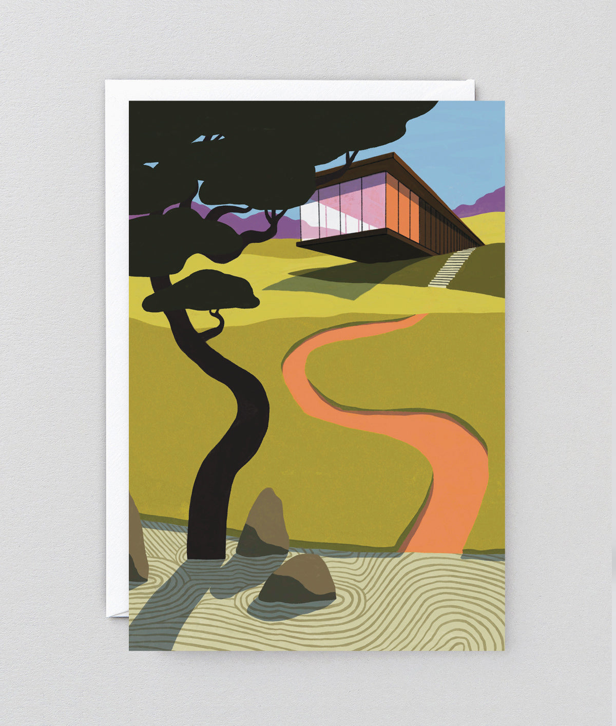 The pairing of modernist architecture against a beautiful natural backdrop creates the perfect room with a view in this colourful art card.