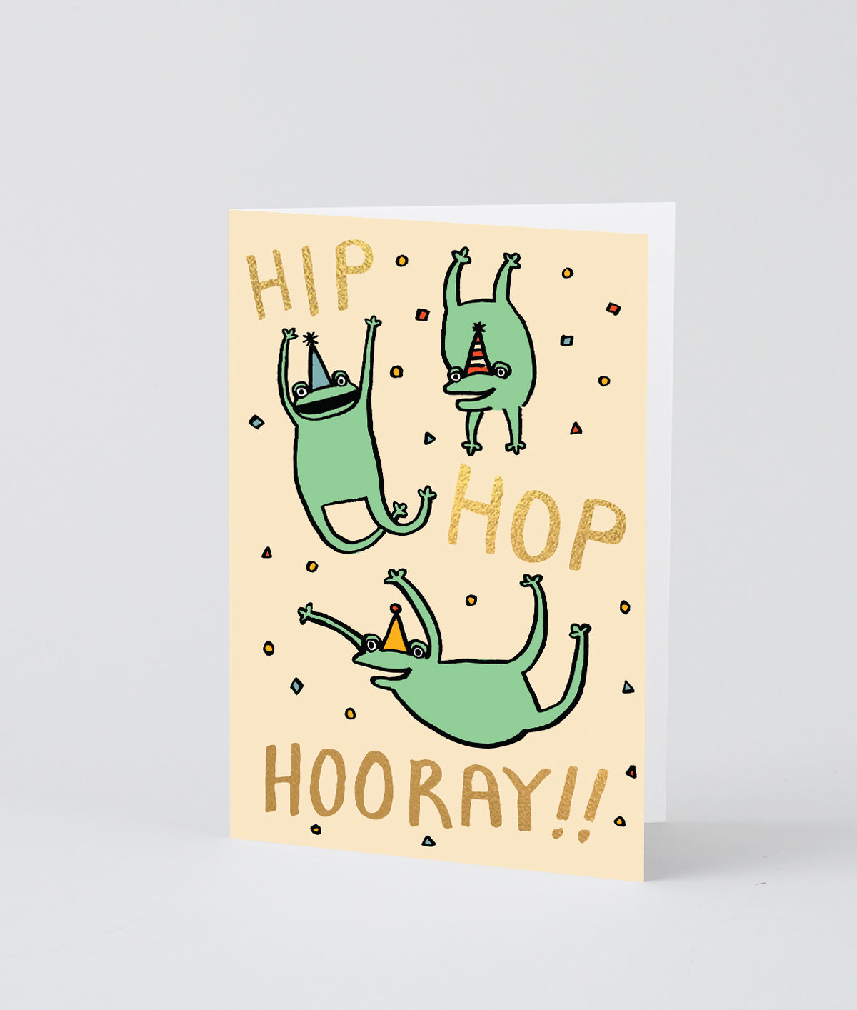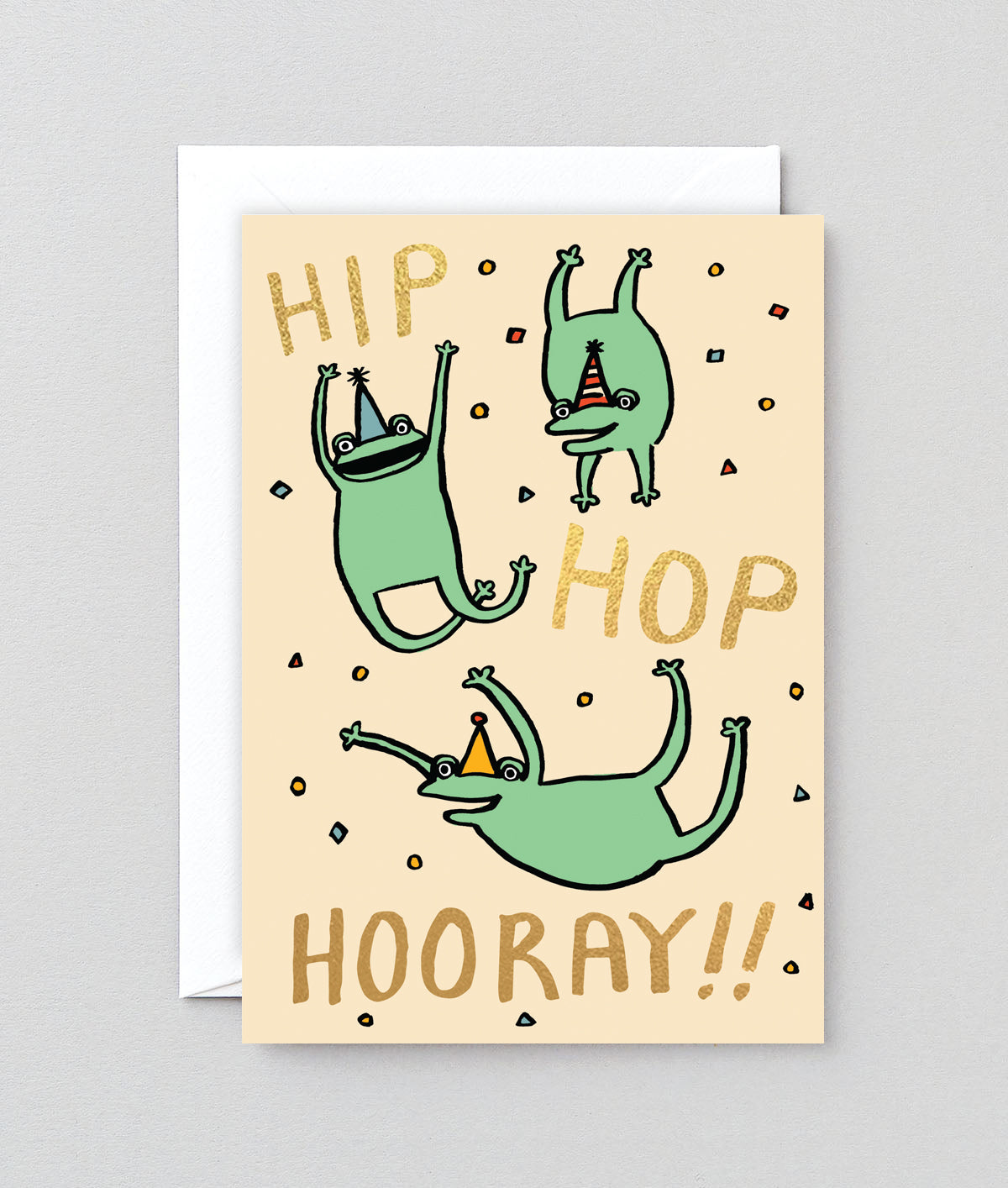 Nothing says ‘birthday’ like jolly amphibians in party hats. Illustrated by Alice Bowsher and finished with gold foil text for an extra special touch.