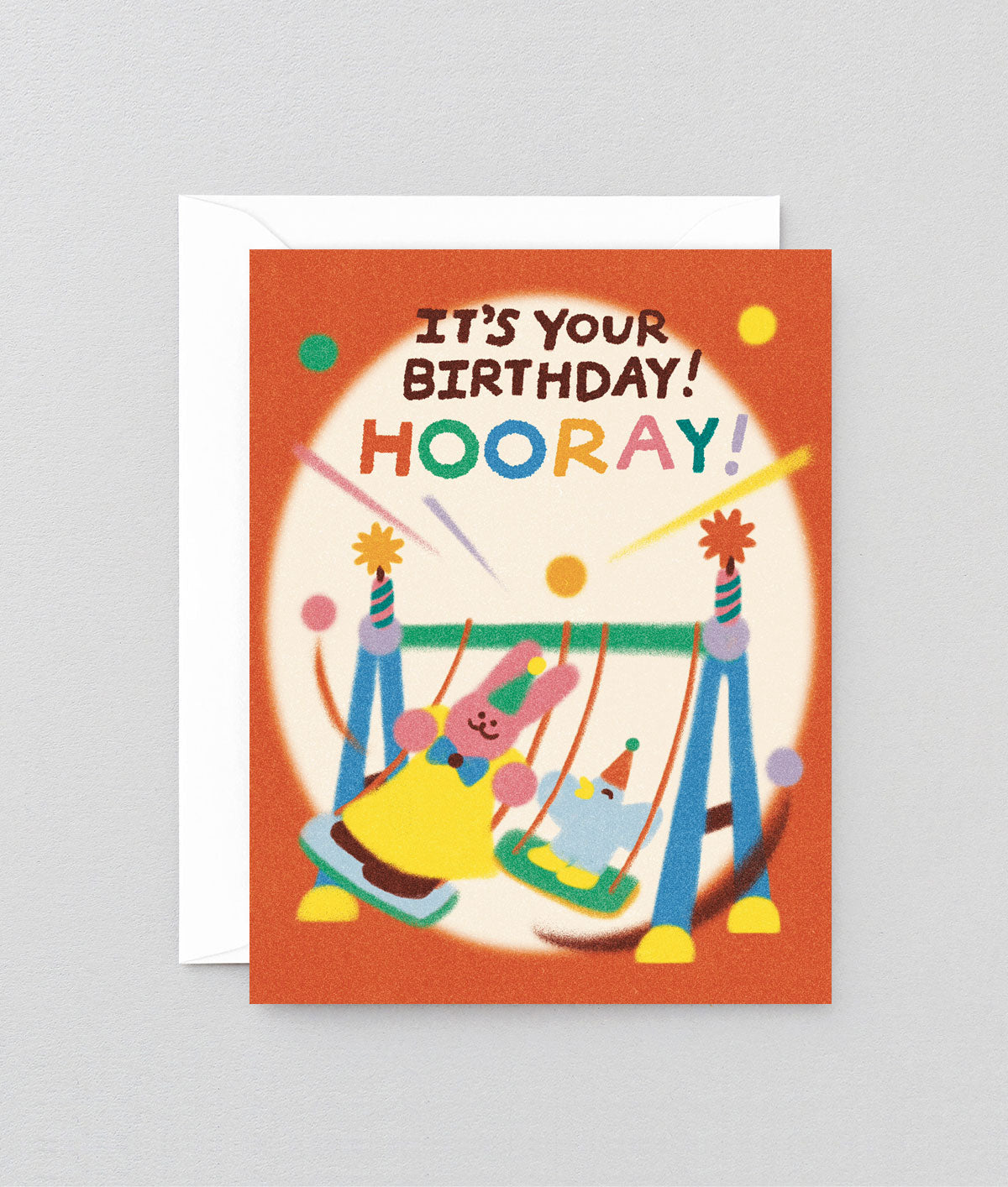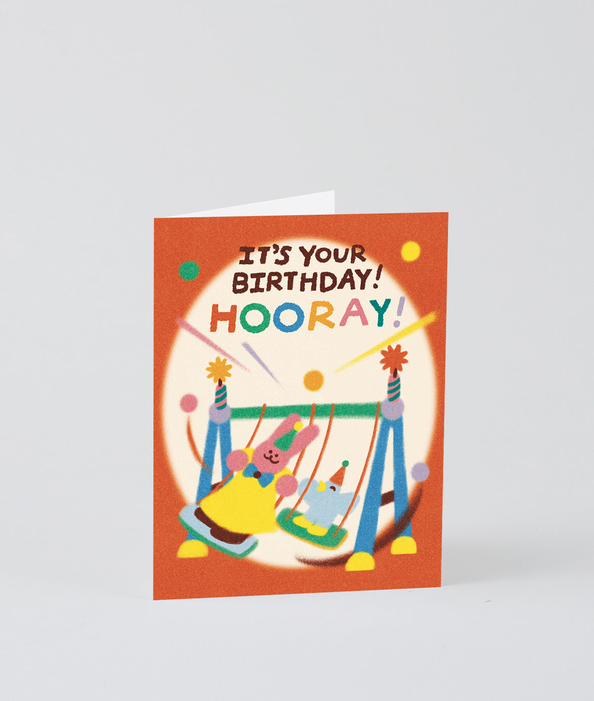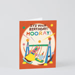 Hooray! It's your birthday! This fun kids birthday card features a rabbit and a bid having a lovely time on the swings.