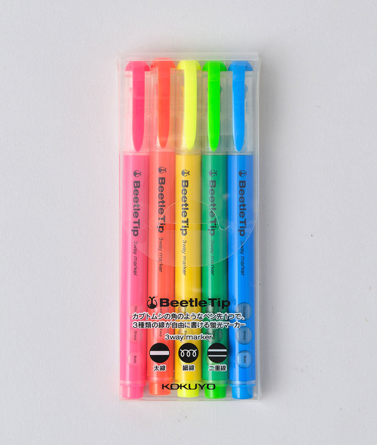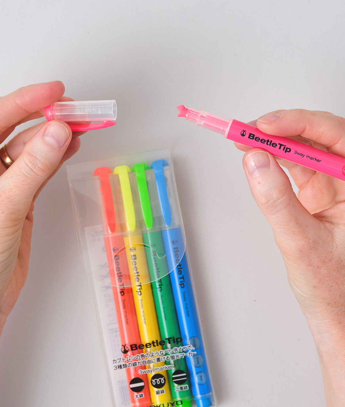 Kokuyo's 3-way highlighter gives you the flexibility to highlight in three different widths; double, fine, or broad. Depending on the angle at which you use the pen and the tip of the 'beetle horns' that you press onto the page, you'll be able to underline words, highlight thicker lines of text or create thinner lines to cover smaller words / single letters.