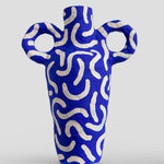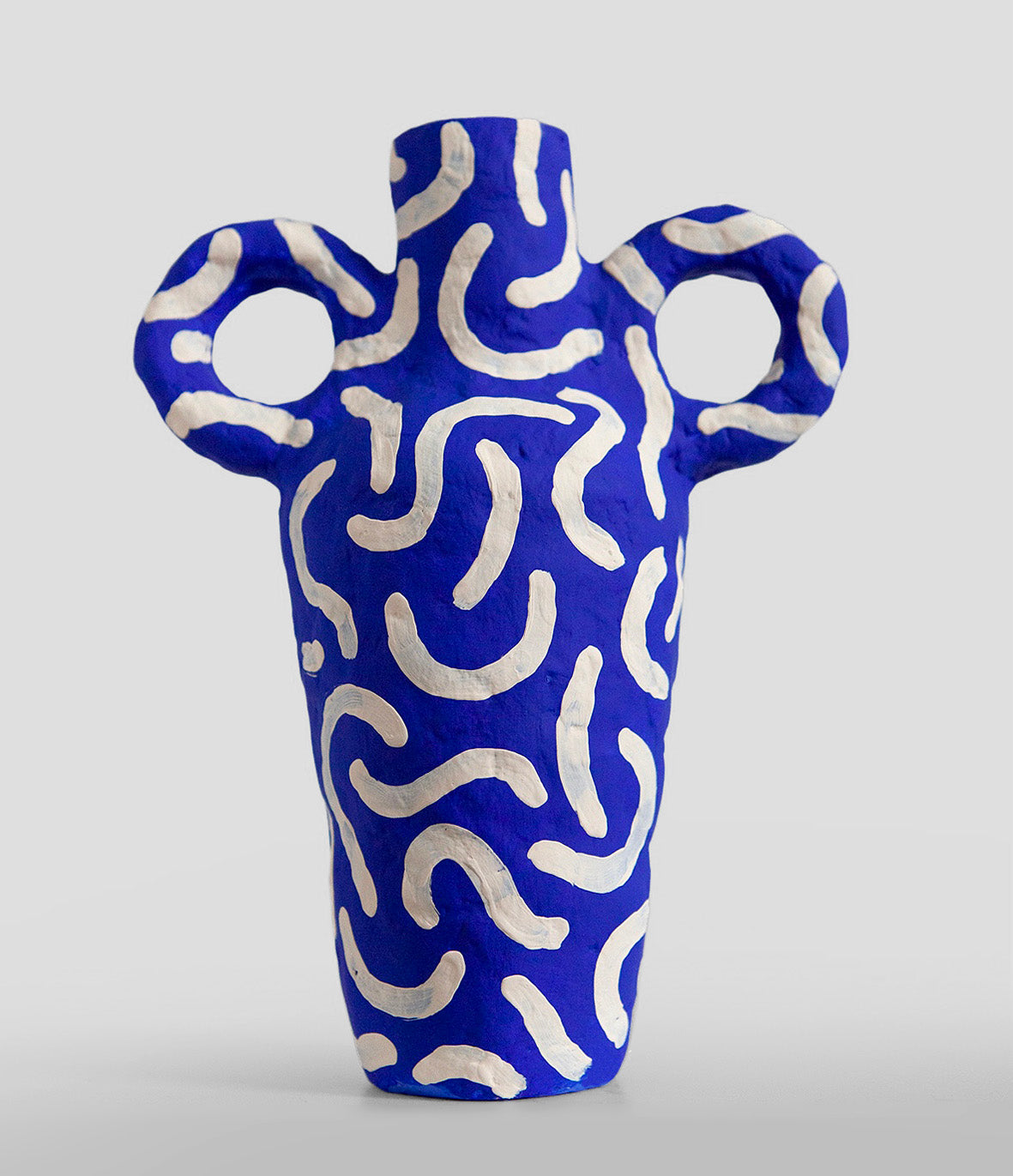 This La Lune Blue Wave Vase is a unique handmade decorative vessel sustainably made from paper-mâché using paper and card waste. A smooth and tactile piece, made with two ring handles painted by hand in Klein blue with waves in soft white matt finish.