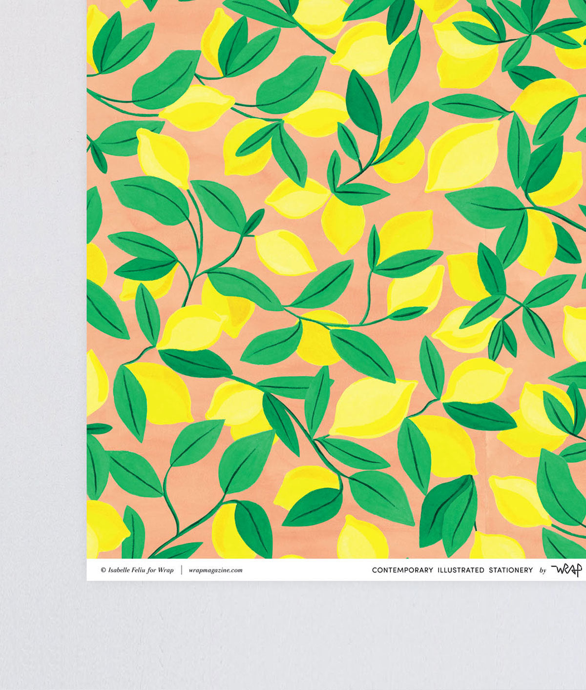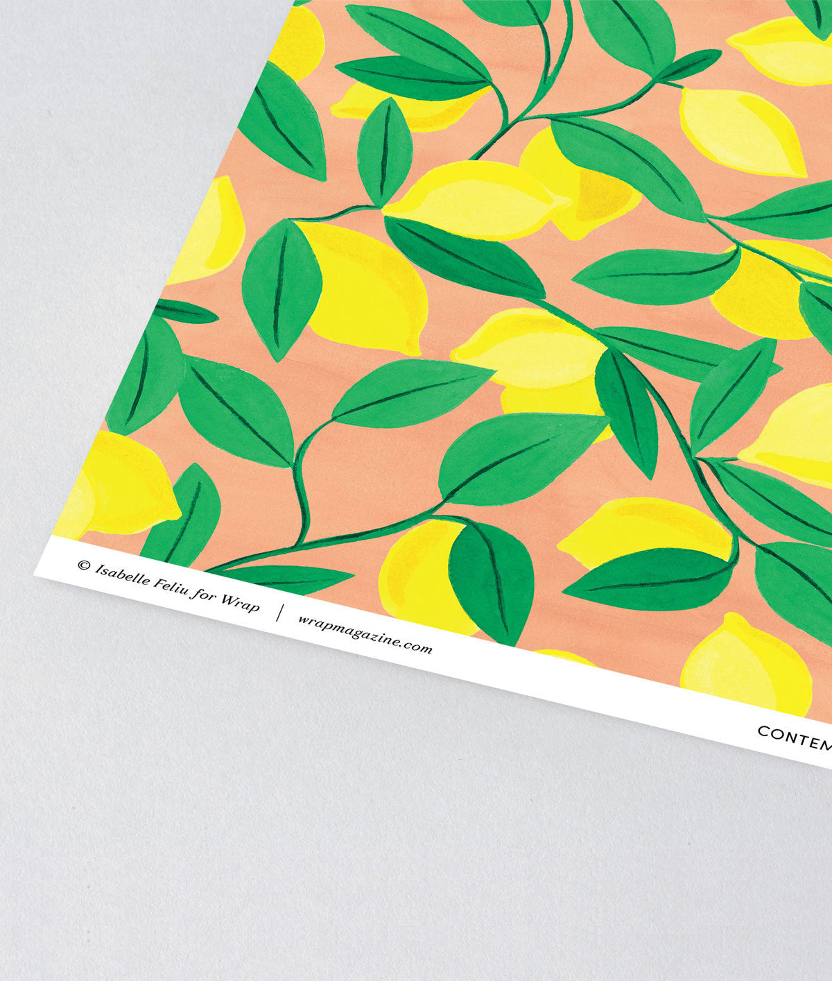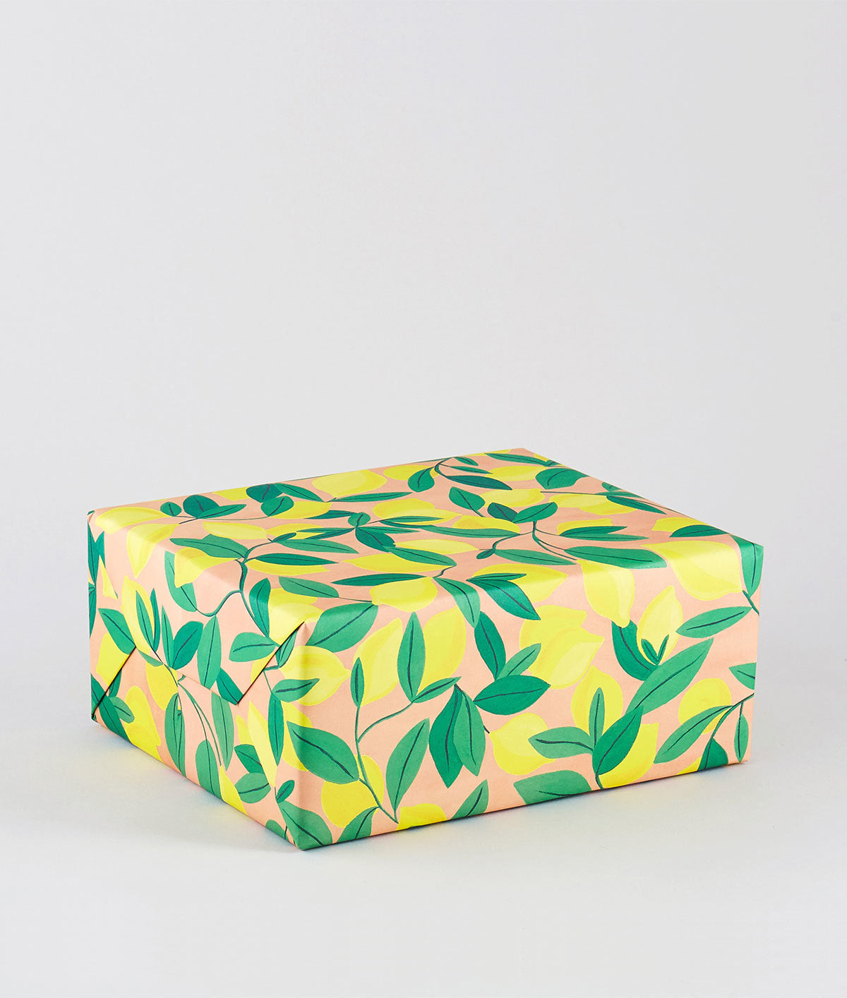 Featuring sunshine yellow lemons, lush green leaves and a soft peach base, this wrapping paper will add a stylish burst of colour to any gift. Hand-painted design by Norway-based artist Isabelle Feliu.