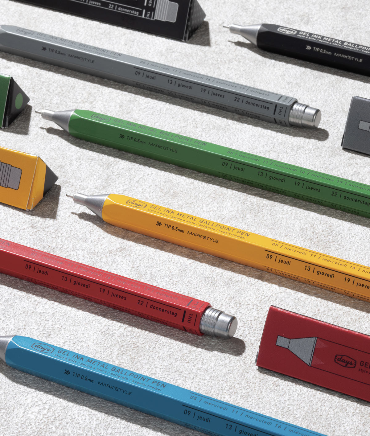 The Mark's Inc. Days Metal Gel Ballpoint Pen is a lightweight gel ballpoint pen designed with comfort and style in mind. Made in Japan and refillable, this is a pen that lasts.