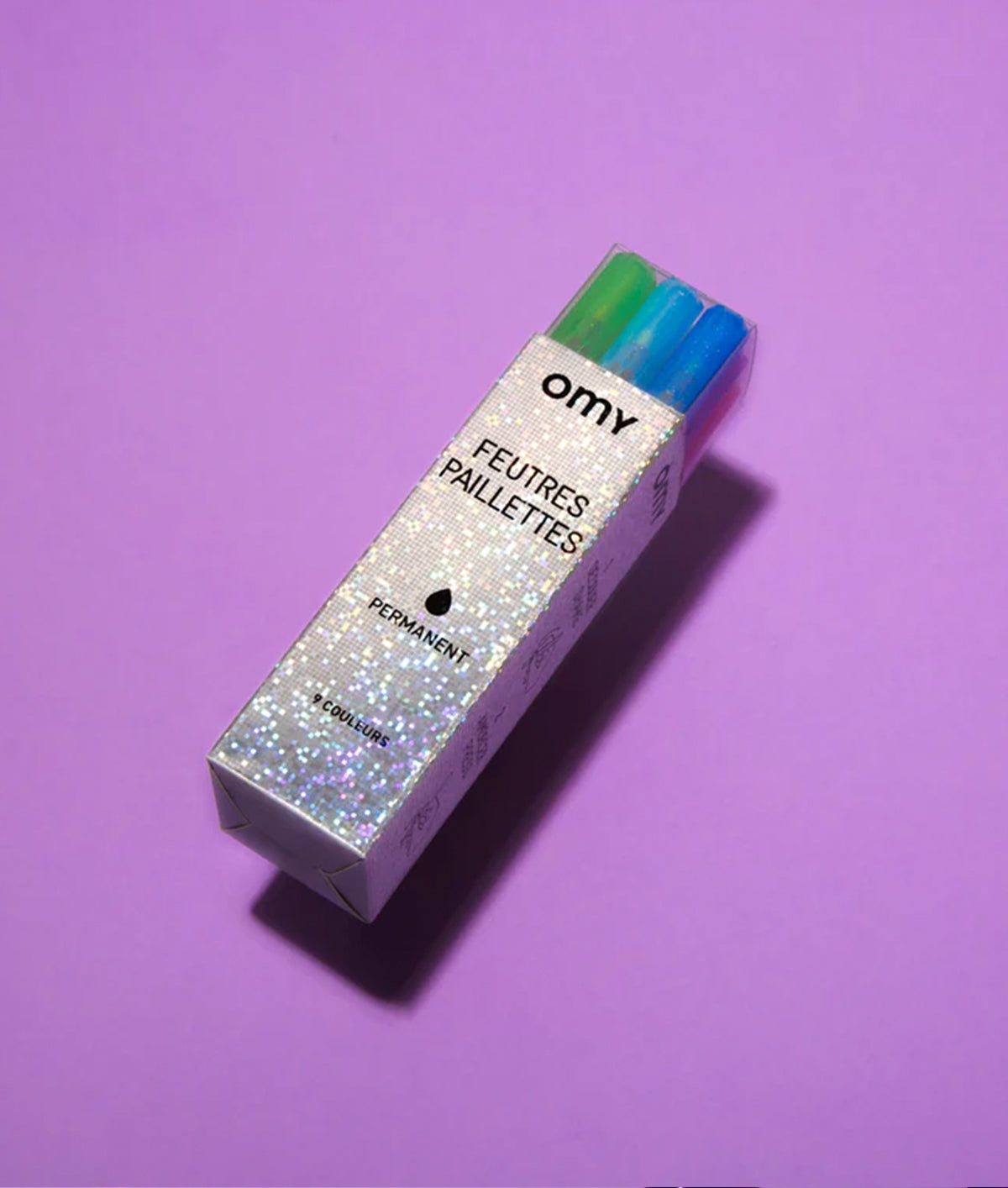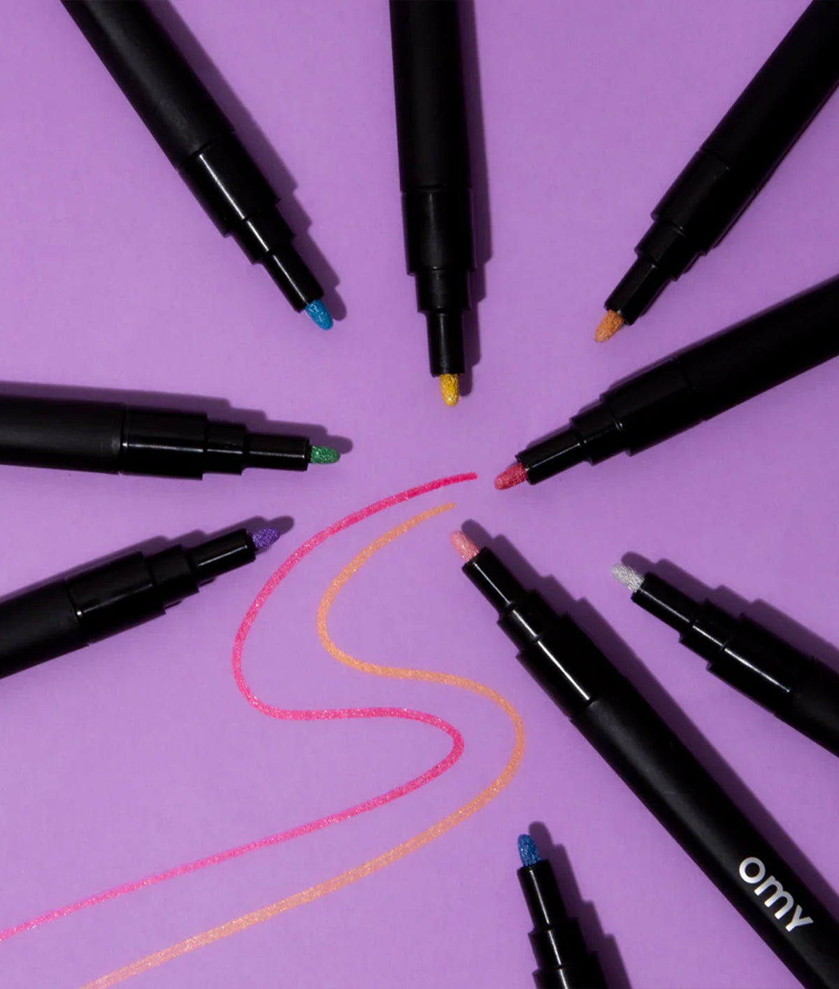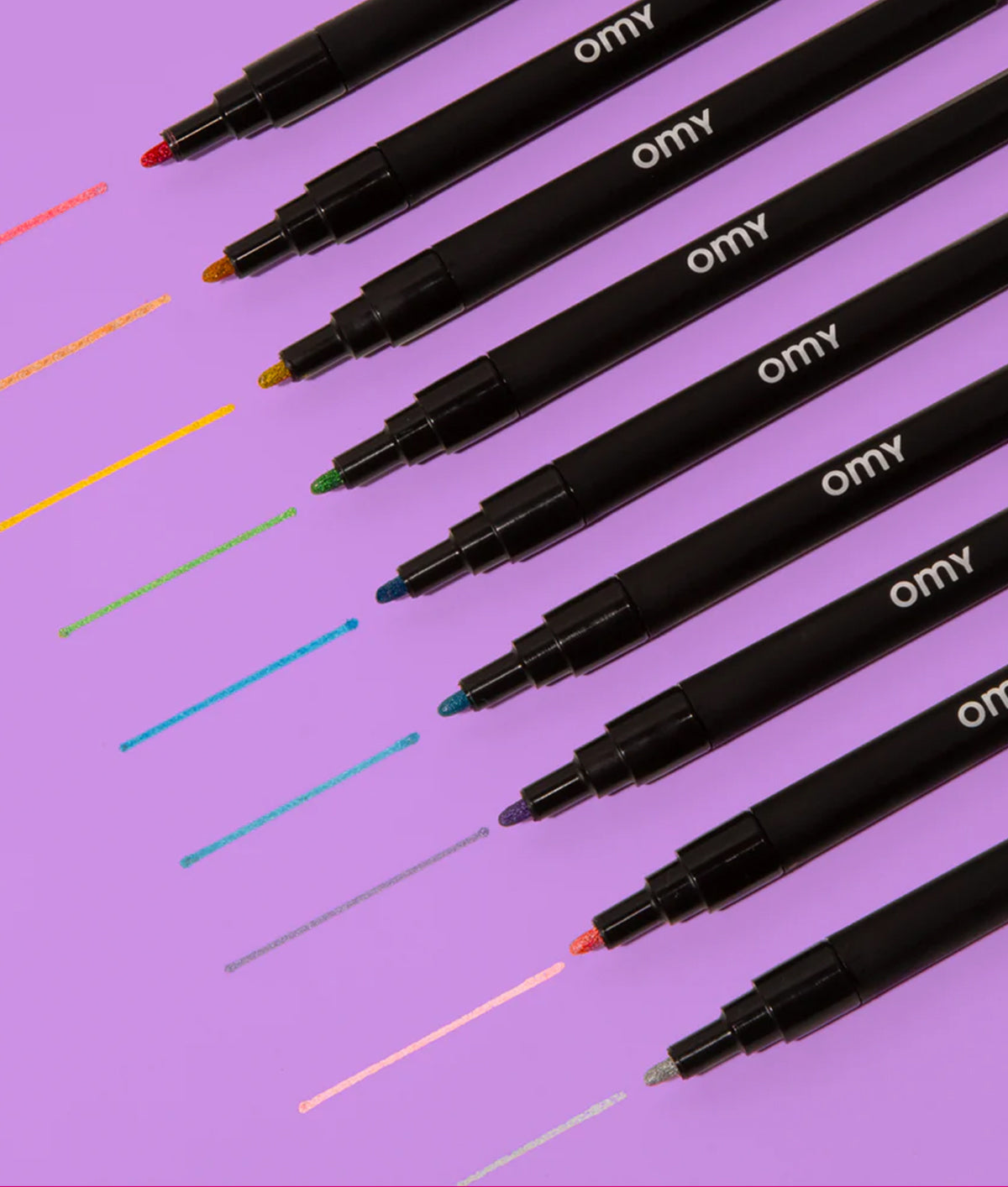 OMY glitter marker pens are a great addition to any aspiring artist's art box. These sparkly pens work on lots of different surfaces and come in nine glittery colours.