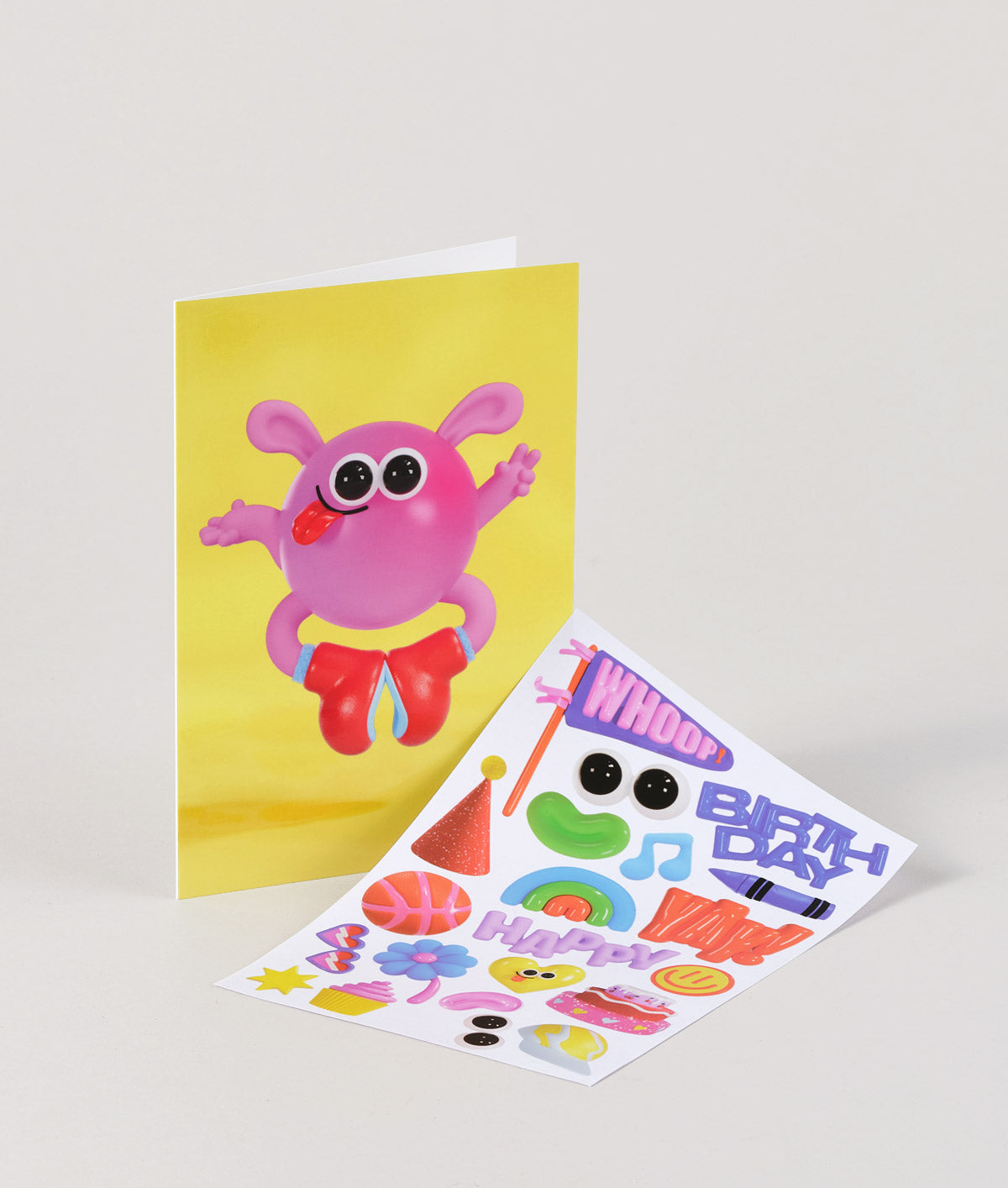 Customise this birthday card with 25 fun stickers from sunglasses and hats to cakes and birthday messages.