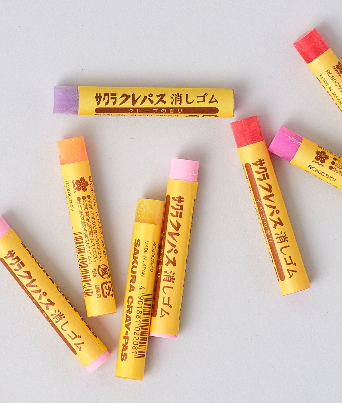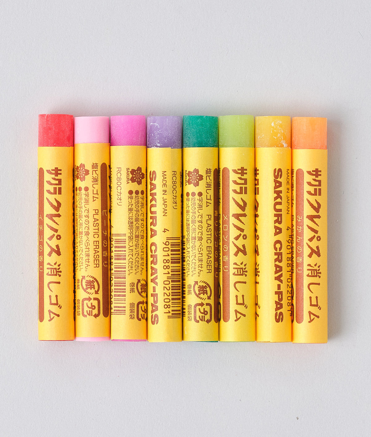 These are not pastels! Designed to look like the iconic Sakura Cray-Pas pastel, these fruity scented round stick vinyl erasers are a super cute way to clean up stray pencil marks.