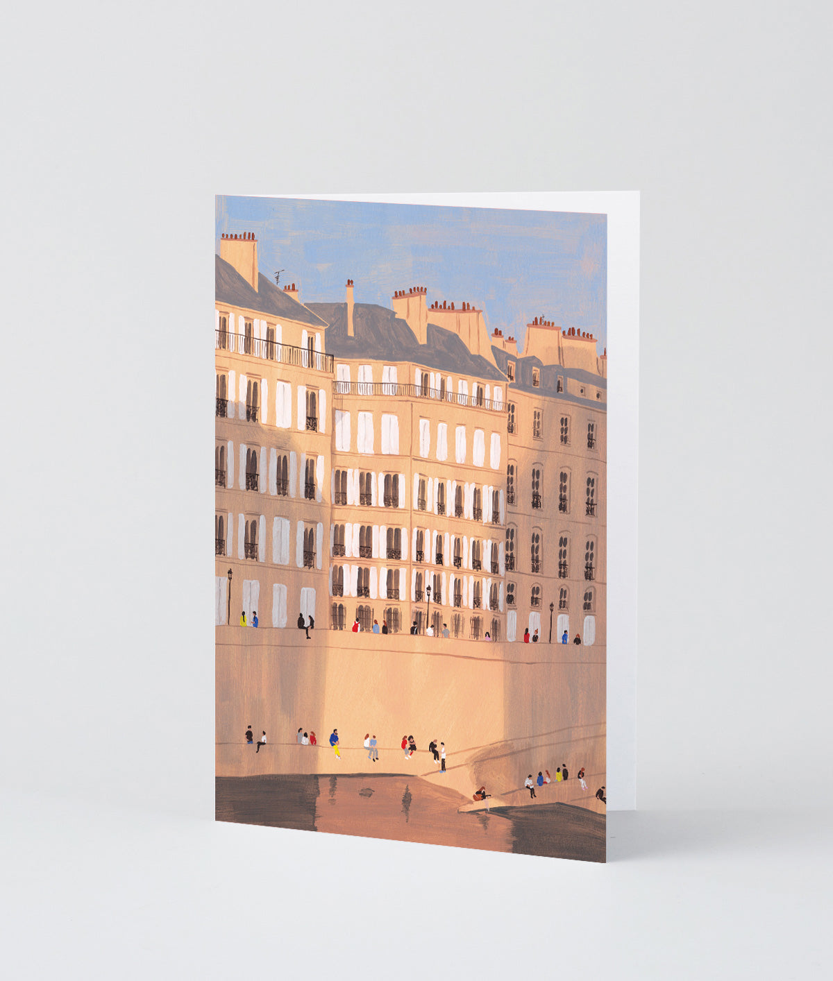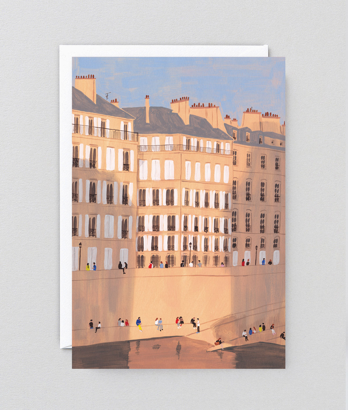 An elegant city scene full of cool evening shade and waterside relaxation.This chic art card design is rendered in a delicate illustrative style and careful detailing.