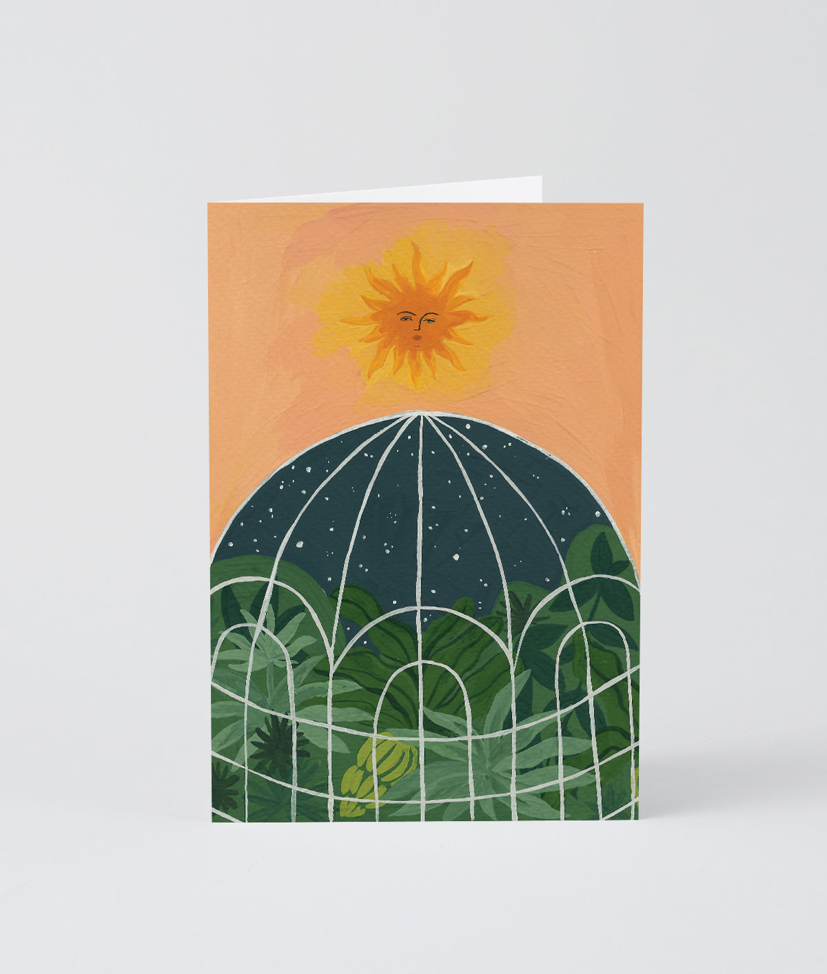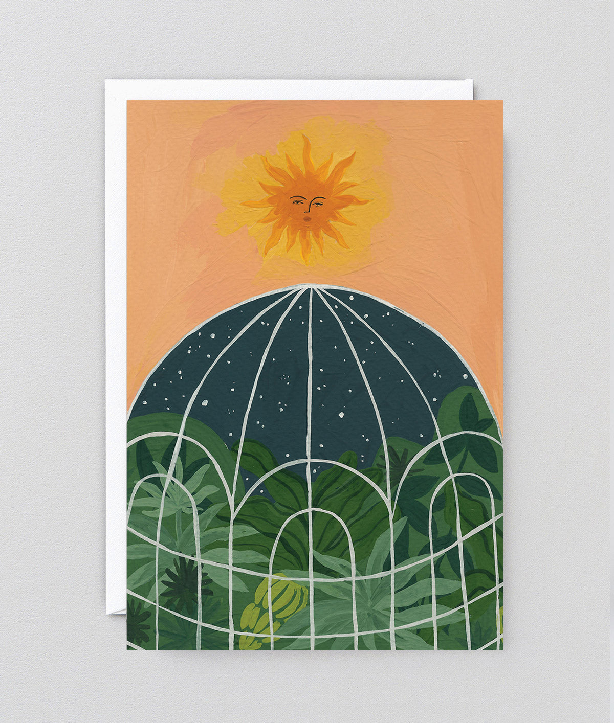 The beautiful textures made by Isabelle Feliu’s paintbrush are still visible on this charming art card, complete with glowing sun and star-studded glasshouse.