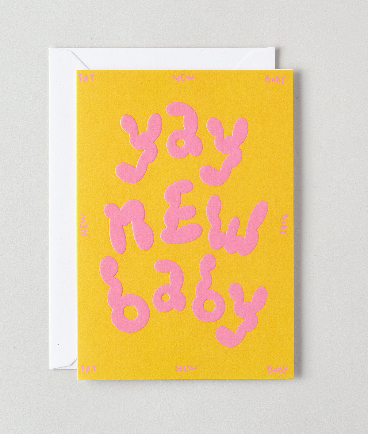 A bright, sunshine infused new baby card to celebrate a new bundle of joy. Designed in a bubbly pink type.